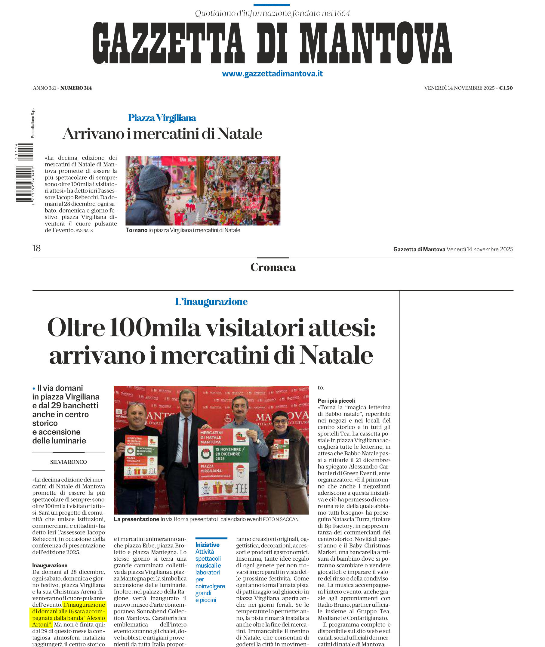 Gazzetta di Mantova 14/11/25 - Arrivano i Mercatini di Natale Leggi tutto: Gazzetta di Mantova 14/11/25 - Arrivano i Mercatini di Natale