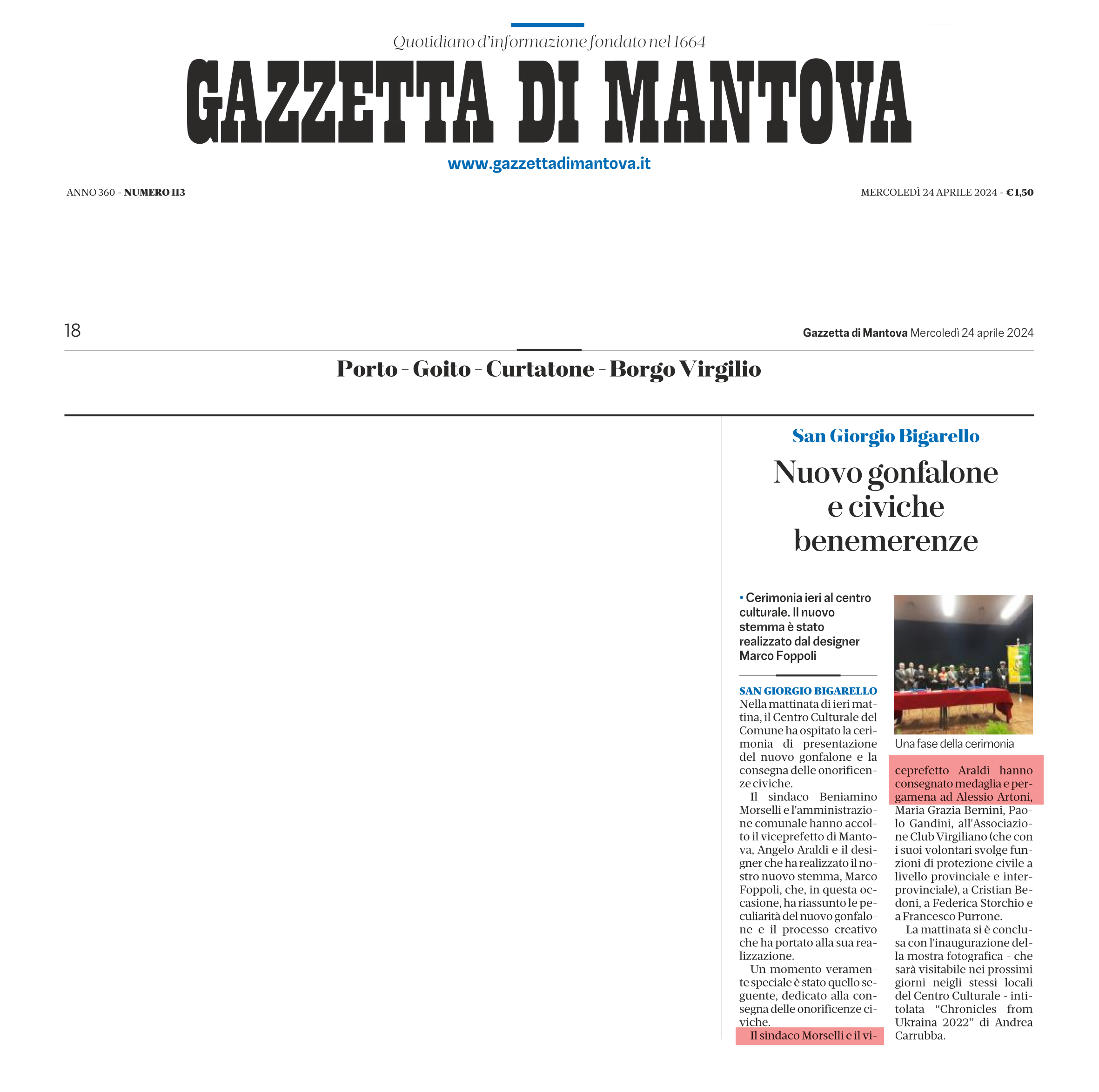 Gazzetta di Mantova del 24-04-2024, Benemerenze civiche di San Giorgio Bigarello Leggi tutto: Gazzetta di Mantova del 24-04-2024, Benemerenze civiche di San Giorgio Bigarello