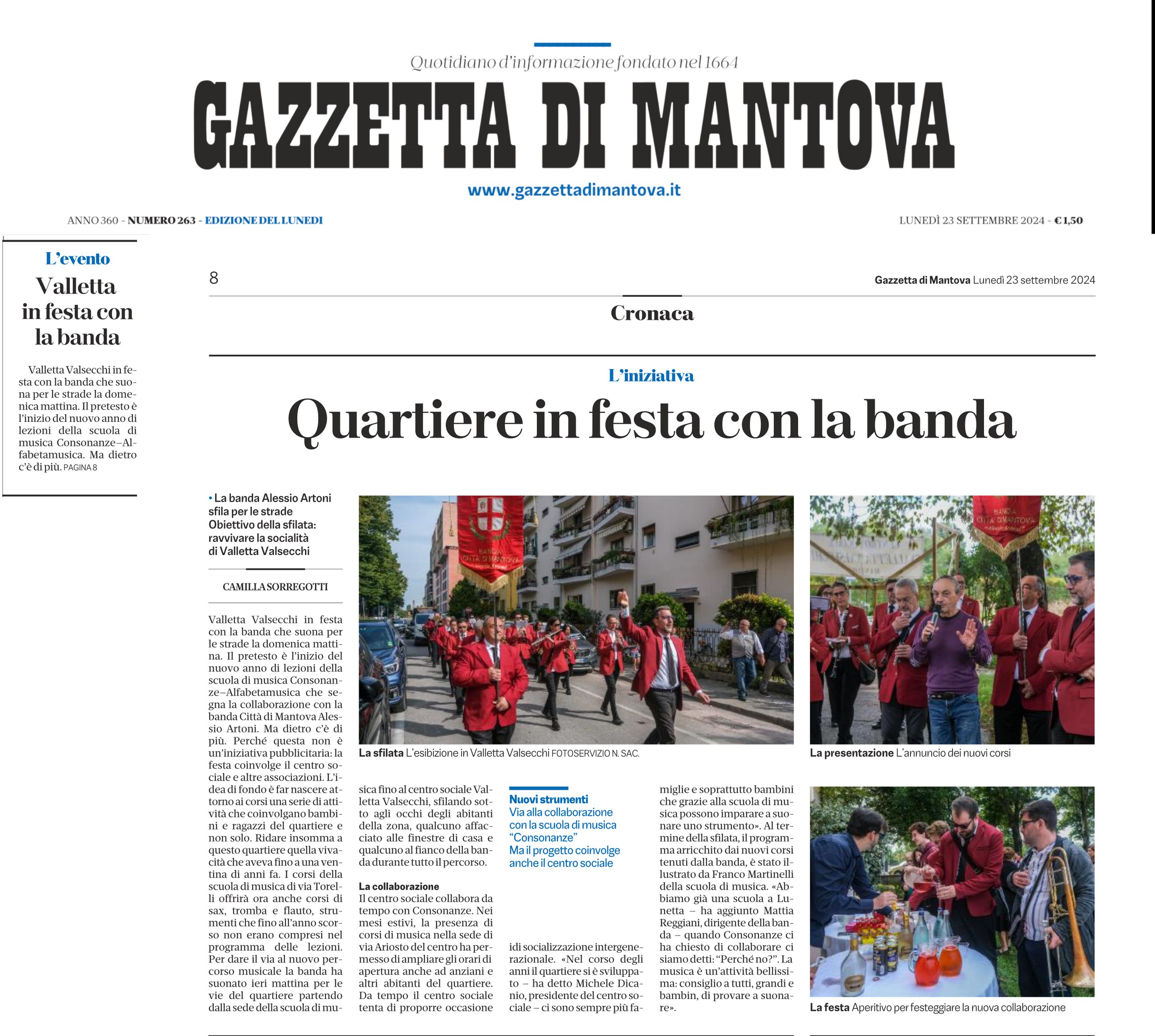 Gazzetta di Mantova del 20-09-2024, La banda per le strade del quartiere Leggi tutto: Gazzetta di Mantova del 20-09-2024, La banda per le strade del quartiere